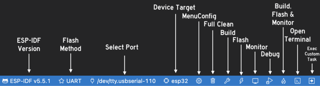 The ESP-IDF extension adds a toolbar to the bottom of VS Code that becomes your command center. You'll want to get familiar with this toolbar at the bottom: